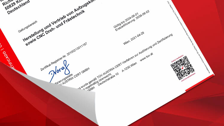 Durch ein Audit des TÜV Austria wurde der Nachweis erbracht, dass unser Management System die Forderungen der ISO 9001:2015 erfüllt. Das Zertifikat umfasst den Geltungsbereich der Herstellung und des Vertriebs von Aufzugkomponenten sowie der CNC-Dreh- und Fräsetechnik.
