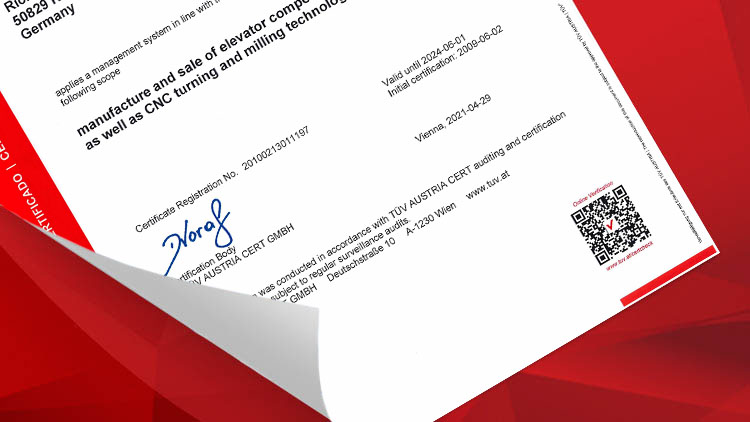 An audit by TÜV Austria proved our management meets requirements set by ISO 9001:2015. The certification's scope covers the production and distribution of elevator parts as well as CNC turning and milling.